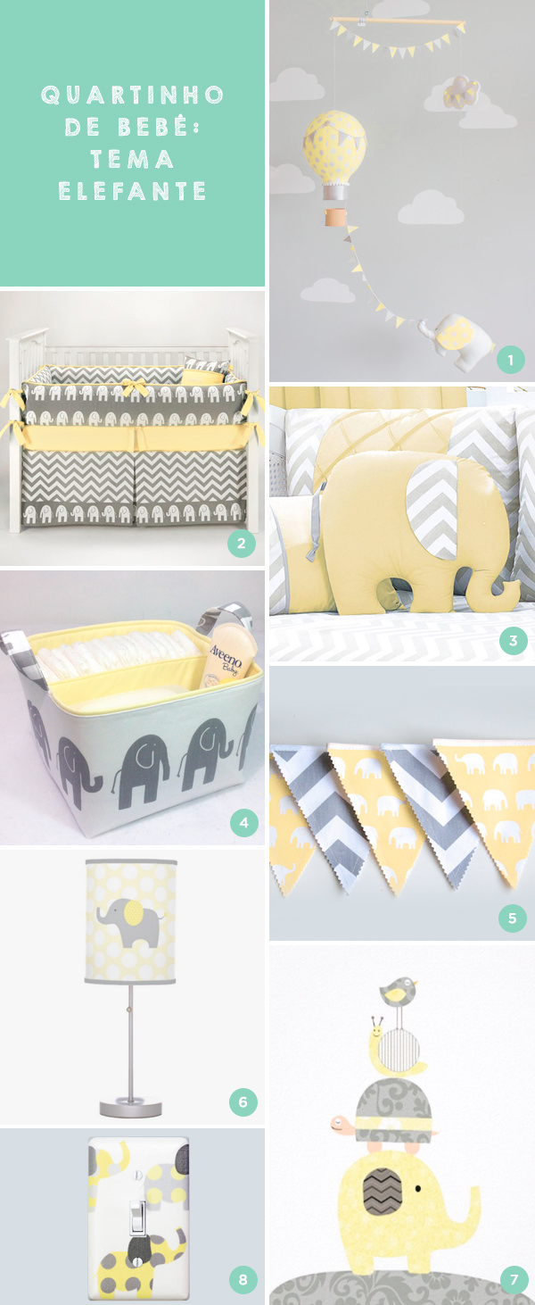 1. Mobile: Etsy | 2. Protetor de berço: Amazon | 3. Almofada: Baby Enxoval | 4. Porta fraldas: Creat4usKids | 5. Bandeirinhas: The Elefant Co. | 6. Abajur: Little Prints Parties | 7. Pôster: Zazzle | 8. Espelho de interruptor: Houzz