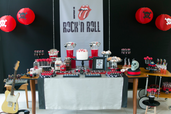 A cartela de cores foi marcada pelo vermelho, preto e cinza. A mesa de doces ganhou itens decorativos importantes para o tema, como bateria, caveira, disco de vinil, mini palcos estrelados para os doces e tags personalizadas.