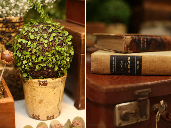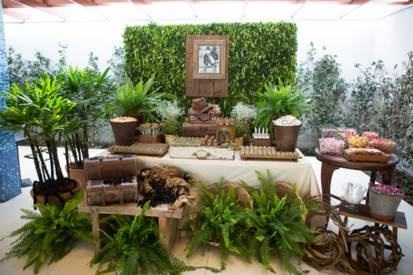 Na mesa, uma arca de madeira, baldes com moedas de ouro (de chocolate), aranhas, a mala e o chapéu do Indiana, livros antigos, cobras e muito verde. Tudo como nas cavernas que o Indiana Jones percorre! E a grande surpresa foi a contratação de uma performance do Indiana Jones que animou a criançada!