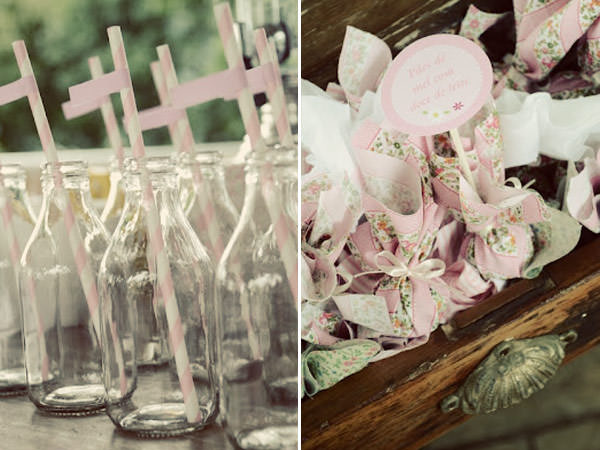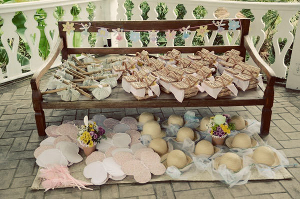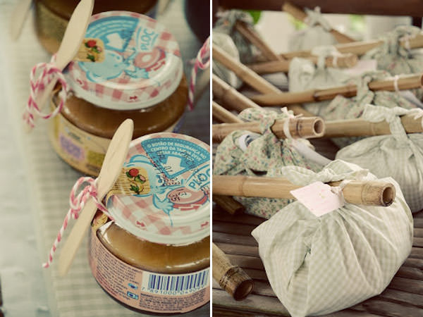 Lembrancinhas: para as meninas, cestinhas de piquenique com lanchinhos saudáveis e asinhas de fadas; para os meninos, trouxinhas no bambu com lanchinhos saudáveis e kit de caçadores de borboletas!
