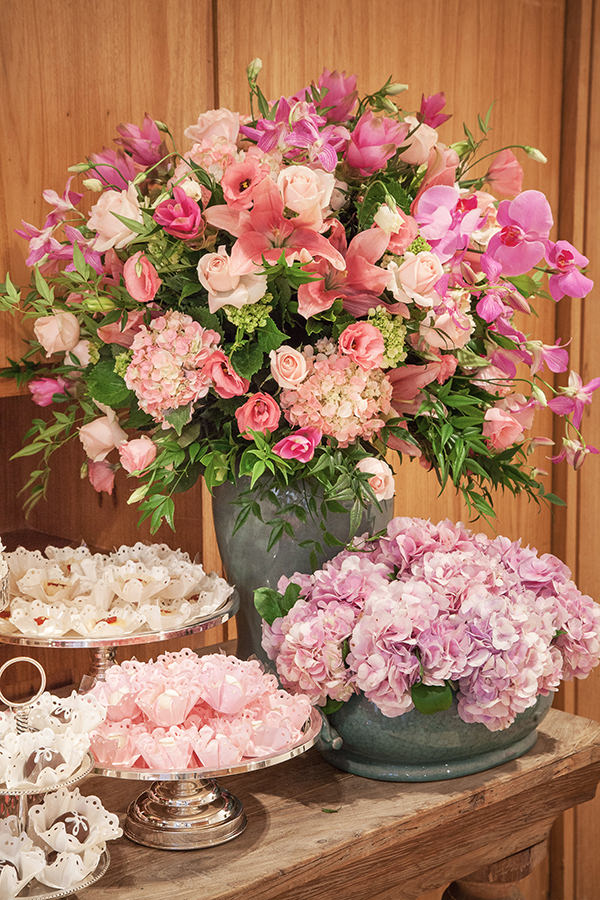 Os arranjos, feitos por elas mesmo, trouxeram rosas, hortênsias, orquídeas e lírios na paleta do rosa. Dá uma olhada nas fotos: