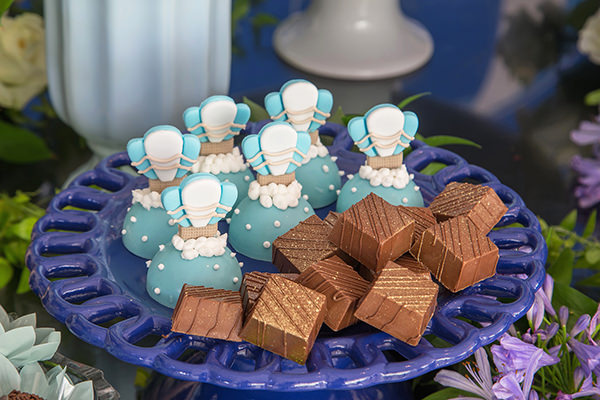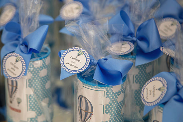 Como o ponto de partida foram os balões, para inspirar a primeira de muitas viagens que o pequeno fará na vida, as irmãs Veridiana e Mará Salomão, que comandam a Estação Primavera, mandaram fazer diversos elementos temáticos, por exemplo: um painel de fundo em azul e branco, bolo e doces, tudo com balões estampados.