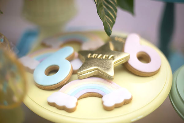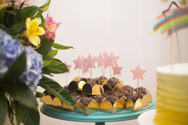 Na mesa de doces, um painel de fundo com luminária de arco-íris da Pop Mobile e cordão de estrelinhas criou o ambiente dos sonhos. Sobre a mesa, peças decorativas do acervo da Partiê e da Pop Mobile receberam a companhia de bolo e docinhos personalizados. Fofos os donuts de unicórnio.