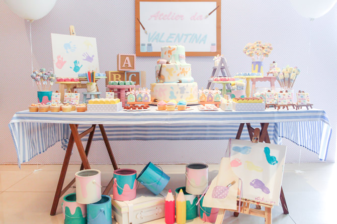 A mesa ficou demais retratando o barco do vilão. Adoramos os baús, barris e boias. “Para dar vida ao fundo da mesa, fizemos esta parede super fofa com fita crepom enrolada e no alto finalizada com balões, tudo dentro da paleta de cores do evento. Compramos mini baús, os envelhecemos e colocamos dentro deles, cordões de pérolas e cordões dourados, simbolizando as jóias roubadas pelos piratas e que foram resgatadas por nossos heróis”, relembra ela.