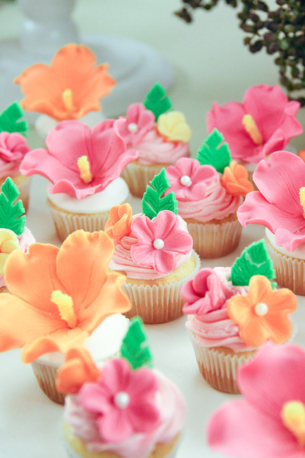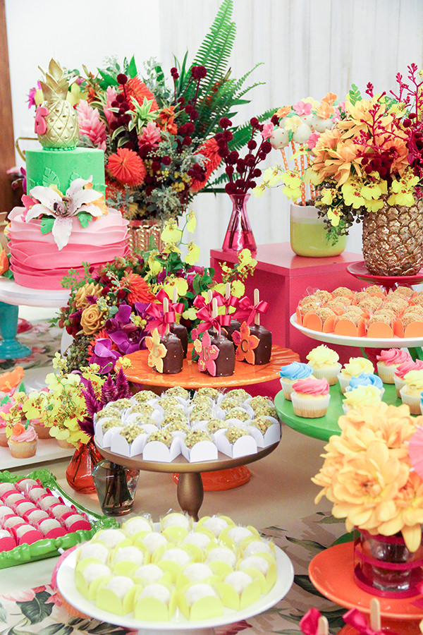 Sobre a mesa de doces, várias delícias personalizadas da Sweet Carolina foram acomodadas nas peças da Pop Mobile. Adoramos o bolo de babados em degradê e abacaxi dourado no topo, e os cakepops com florzinhas havaianas.