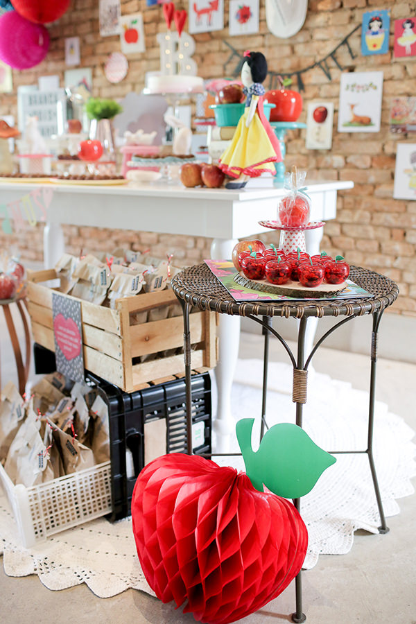 Rejane tem um bom gosto e olhar apurado nato, e decidiu colocar a mão na massa e fazer toda a decoração. “Quando optei por este tema, já de cara resolvi que não queria fazer uma Branca de Neve muito óbvia e nem com cara de Disney. Faria algo mais personalizado, mais “caseiro” e também mais colorido. Não queria que fosse nada muito “combinandinho”, mas sim uma grande mistura que no final ficaria bonita. Também não queria que fosse extravagante ou “ostentação”, mas sim que tivesse cara de que foi feito à mão e com carinho, como de fato foi.”