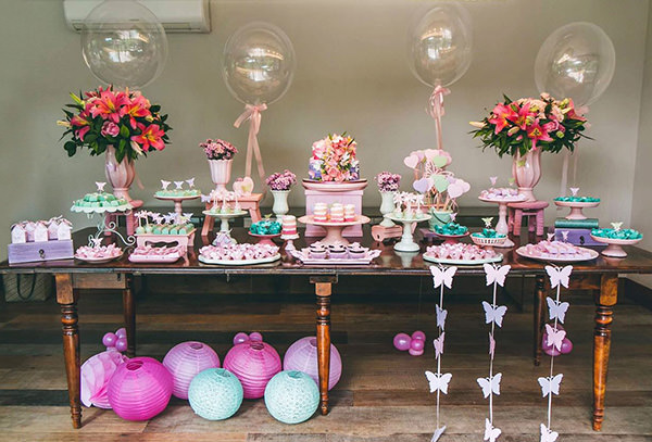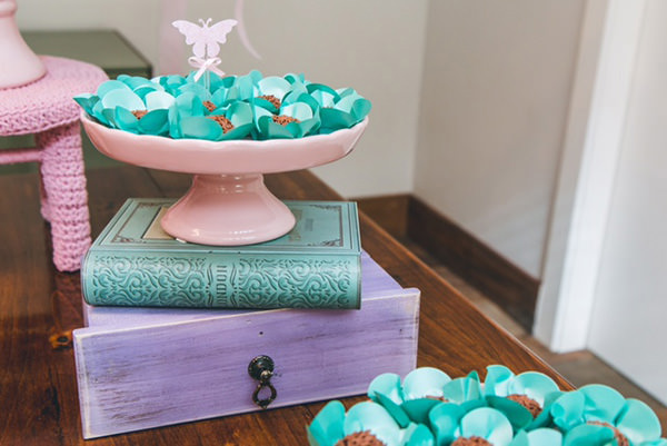As borboletas invadiram a festinha de hoje! A decoração, assinada por Monde Coloré, ficou uma graça e em tons de roxo e rosa. Para deixar a mesa de doces deliciosas, a Arquitetura do Açúcar preparou um bolo decorado com flores e cupcakes personalizados com mini borboletas. Para arrematar o decor e dar movimento à mesa, pratos altos e baixos.