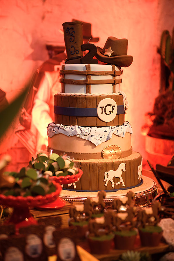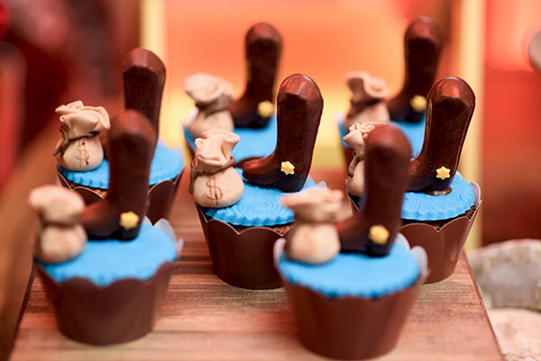 Para a mesa de doces, mini cactos em cupcake, mini retratos do procurado The Kid, carroças, bolas, selas e esporas em biscoitos, pirulitos de chocolate com a logo do cowboy aniversariante, elementos e peças do velho oeste. O bolo rico em detalhes trazendo os ícones do cowboy (chapéu, fivela, botas, laços).
