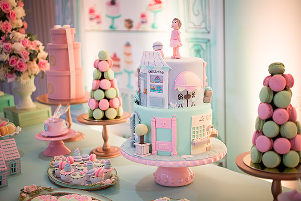 E para compor a mesa de doces em tons pastel, o Atelier Jeniffer Bresser fez caixinhas personalizadas com a fachada da loja de Paris e com o nome da aniversariante. Adoramos as caixas de presente com as iniciais da pequena. Cupcakes coloridos e torres de macarons completaram e deram diferentes alturas para a mesa.