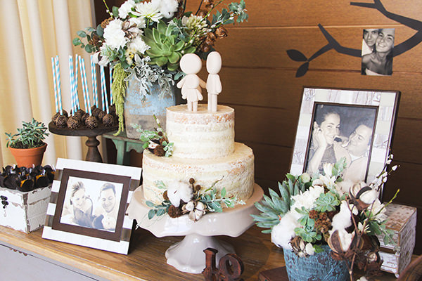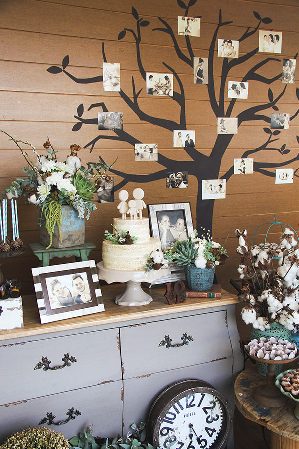 No lugar de uma mesa, Fabiana apostou em um mix de peças, o que deu ainda mais movimento para a produção. E já que a história estava em foco, móveis vintage trouxeram o perfume do passado. Espalhado pela decoração e na árvore do painel de fundo, fotos em preto e branco e sépia.