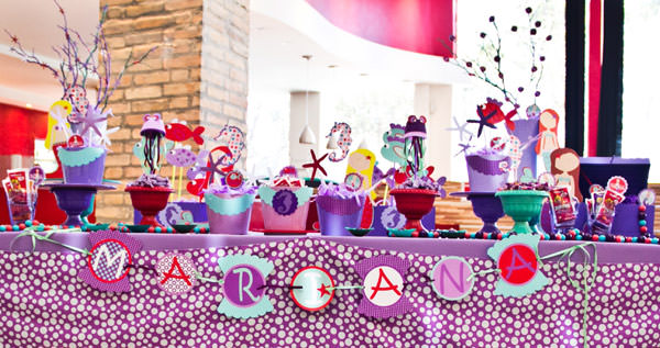 Como a mamãe ama praia e queria uma festa bem feminina, a decoradora Kika Bernardes teve a ideia de criar uma ambientação fundo do mar nas cores salmão e azul turquesa. Sereias, conchas e peixinhos enfeitaram a mesa. O resultado ficou diferente e encantador!