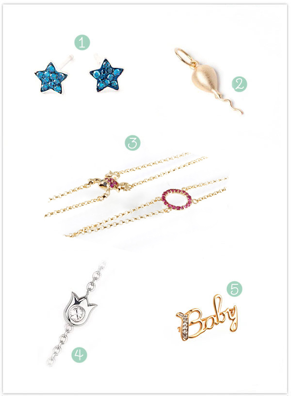 1. Brinco estrelinha de diamante azul: Petit Galerie | 2. Pingente balãozinho: Áurea Sacilotto para Bébé Sucré | 3. Pulseira sapo com rubi e pulseira rubi: Elisabete Gaspar | 4. Pulseira com relógio: Cartier | 5. Alfinete Baby: Lydia Dana