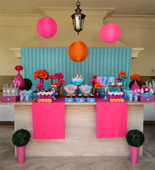 A decoração ficou por conta da Party to be!, que usou uma cartela de cores bem vibrante para combinar com o clima da festa – azul tiffany, pink e laranja. Gérberas e elementos decorativos de piscina, como boias e bolas coloridas, complementaram a produção.