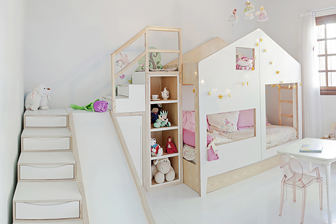 Começou na semana passada a mostra Quartos Etc. em Brasília, e entre os ambientes mais legais está o quartinho para meninas gêmeas da arquiteta Juliana Leão. No espaço, a profissional acertou em cheio ao dividir o amplo espaço que tinha em dois: área de brincar e de descanso.