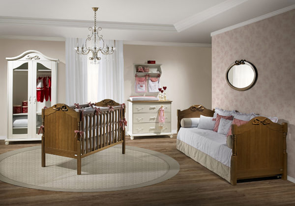 Vocês já devem ter percebido que os berços de madeira maciça, com design clássico, estão em alta. E nós achamos esse lacinho entalhado simplesmente uma graça! Já postamos um quartinho de menina com móveis parecidos – mas com uma pegada mais rústica – aqui. Enquanto a decoração abaixo pode ser uma boa inspiração para as mamães mais clássicas. Os móveis, acessórios e o enxoval são da Tulipa Baby: