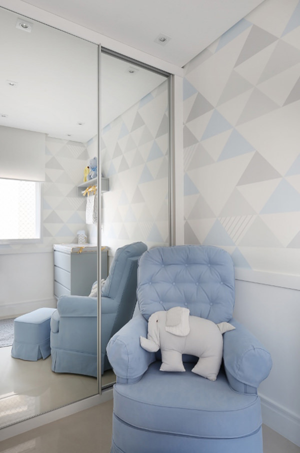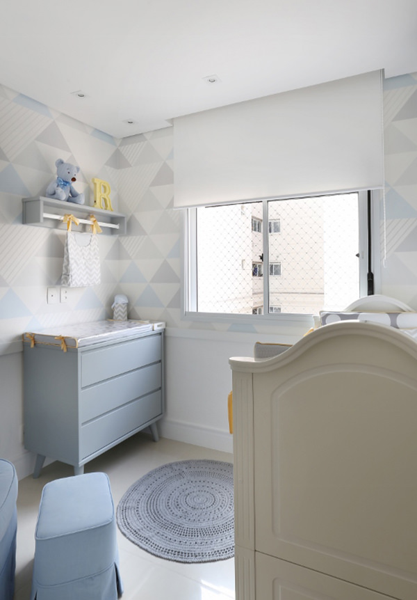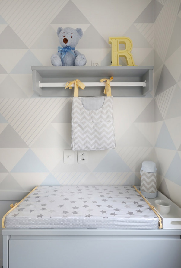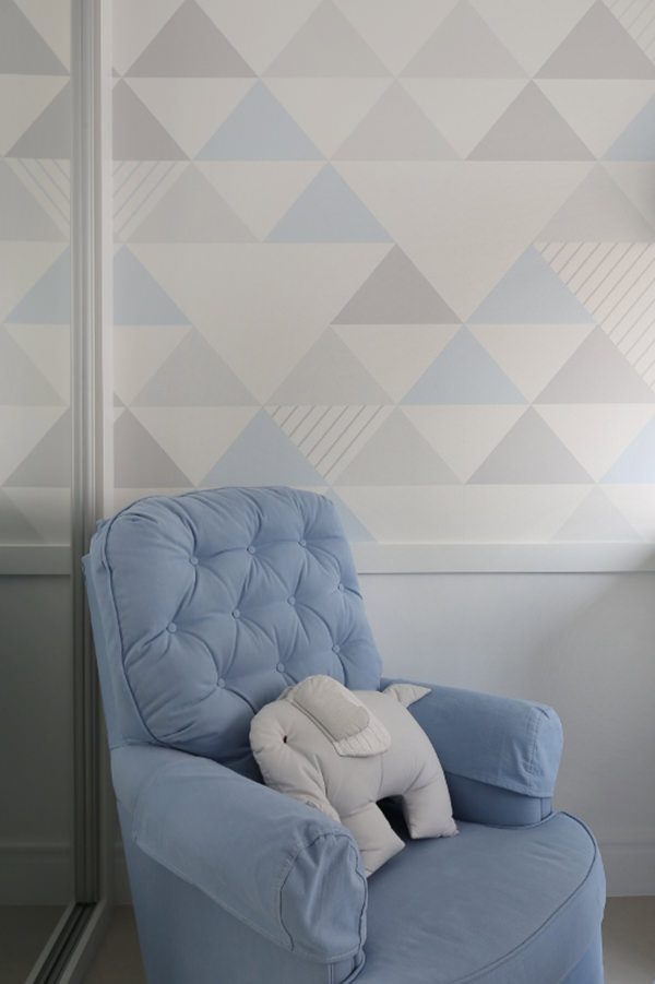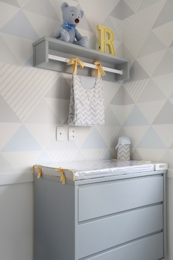 Quarto de bebê com decoração geométrica em cinza e azul