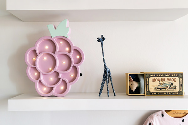 Dentre os temas presentes do quartinho, os animais, principalmente a girafa, e as frutas marcaram presença na decoração. Adoramos o papel de parede pintado à mão e a luminária de Uva da Ameise Design. E por falar na marca, é dela também os móveis, que foram personalizados nas cores do ambiente. Dá uma olhada nas fotos: