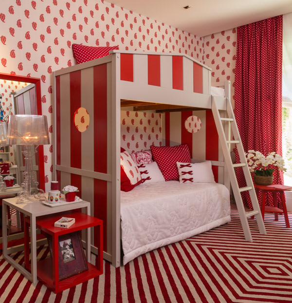 A arquiteta Zize Zink projetou esse quarto para uma menina antenada e muito descolada! O ousado mix de estampas em vermelho e branco dá o tom da decoração moderninha. Destaque para o lindo beliche listrado, que torna a hora do sono uma divertida brincadeira!