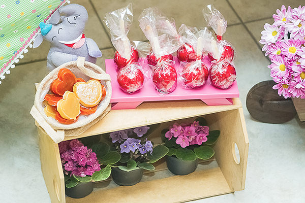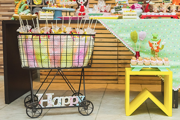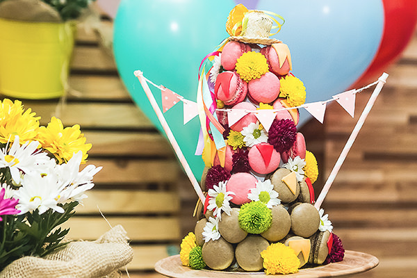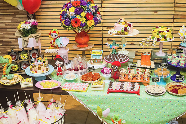 Para deixar a festinha deliciosa, a decoradora apostou em dois bolos bem coloridos da Arquitetura do Açúcar, pâtisserie que também fez a torre de macarons. Para arrematar a produção, doces clássicos como coração de abóbora e maçã do amor.