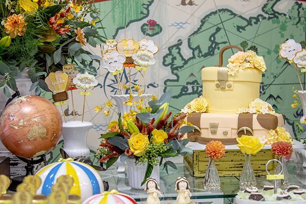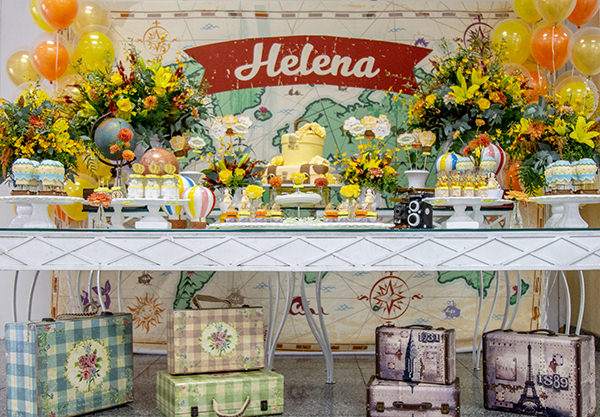 Logo na entrada do espaço do evento, os convidados avistaram um painel de balões com o mapa-múndi e um avião, introduzindo o tema super criativo. Na mesa do bolo, as peças decorativas foram o grande destaque: aviõezinhos, máquina fotográfica, malas, plaquinhas de indicação, além de monumentos conhecidos, como a Torre de Pisa, a Estátua da Liberdade e a Torre Eiffel. Todos os objetos remetiam à experiência única de desbravar um novo lugar com todas suas peculiaridades.
