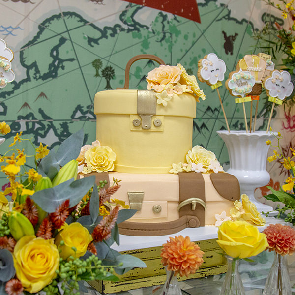 Além dos docinhos tradicionais, dispostos em forminhas coloridas, doces decorados com malas e bandeiras e bolinhos com passaporte, cartão de embarque, câmeras e aviões compuseram a mesa. O bolo de quatro andares foi uma atração por si só! Em formato de mala na base e com um globo no topo, ele retratou o tema de forma lúdica e muito detalhista.