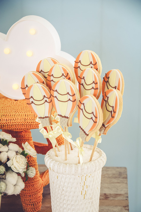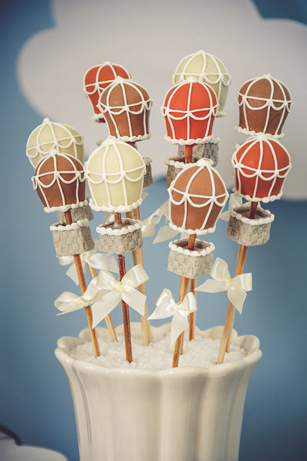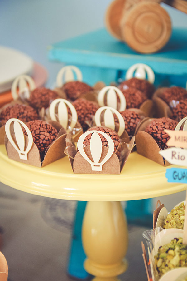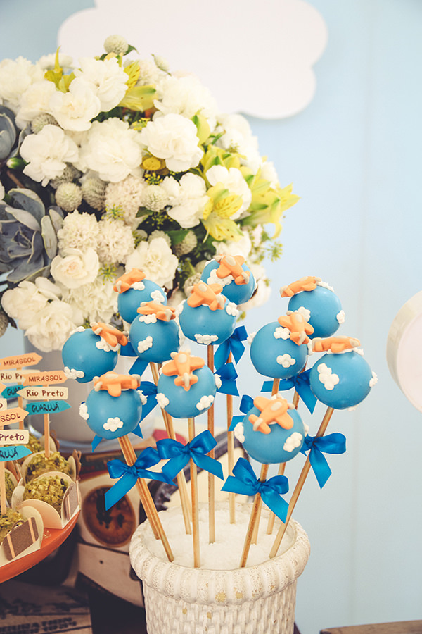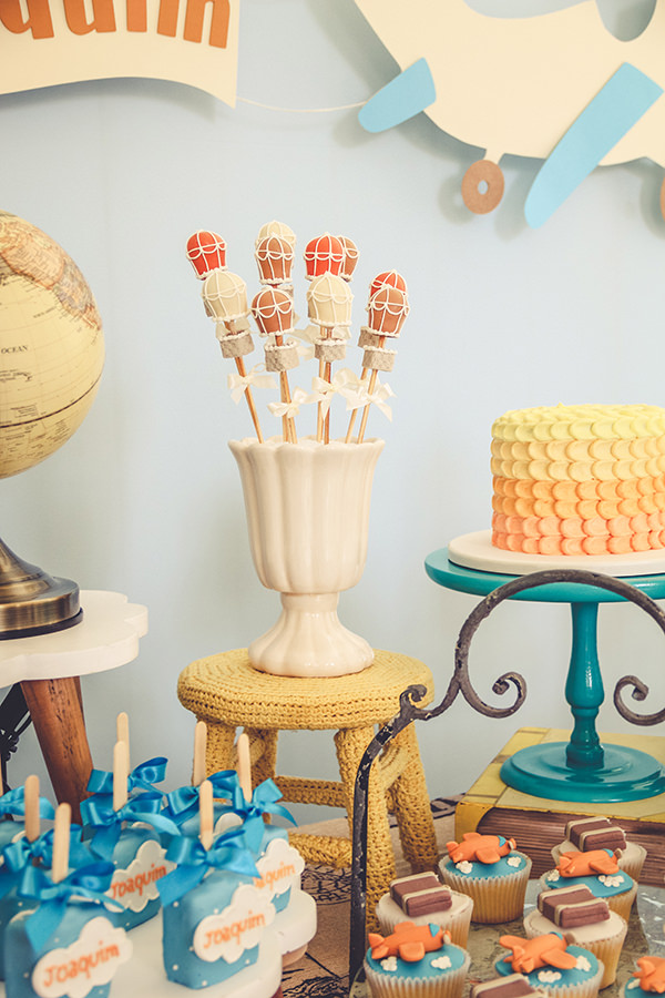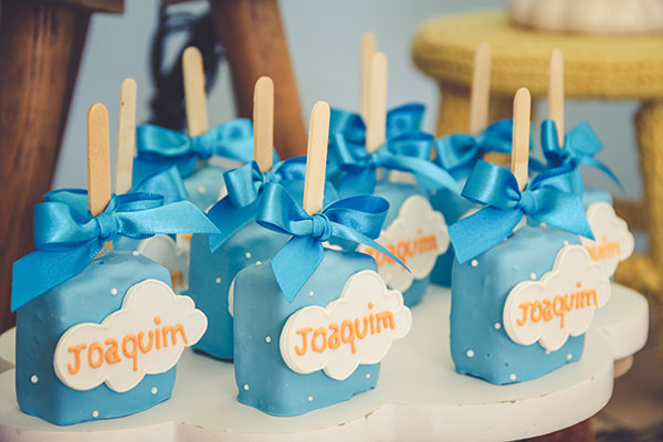 Para compor a mesa de doces, mix de bolos, e diversos docinhos personalizados. Os cakepops de balões ficaram charmosos, assim como os cupcakes e biscoitos no palito.