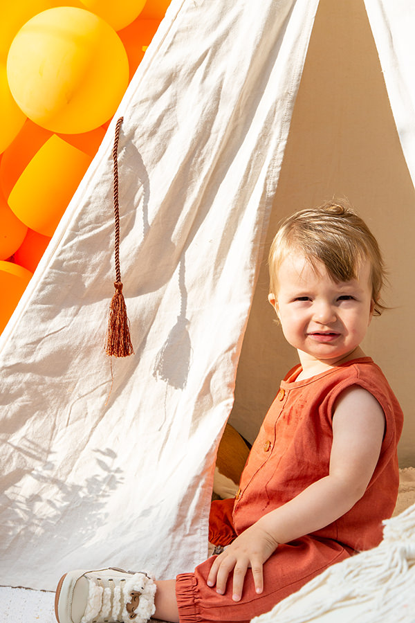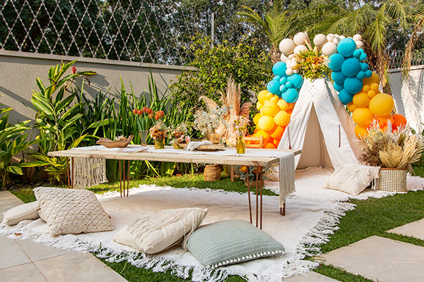 No jardim, uma cabaninha decorada com balões e a mesa com almofadas no chão reforçavam o clima descontraído de uma celebração intimista.