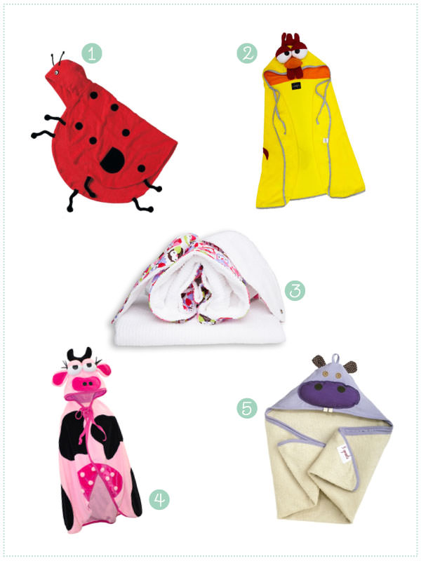 1. Toalha de joaninha: Os Quindins | 2. Toalha de monstrinho: Nosh | 3. Toalha de coelho: Raquel Almeida Prado | 4. Toalha de vaquinha: Nosh | 5. Toalha de hipopótamo: Baú da Lulu